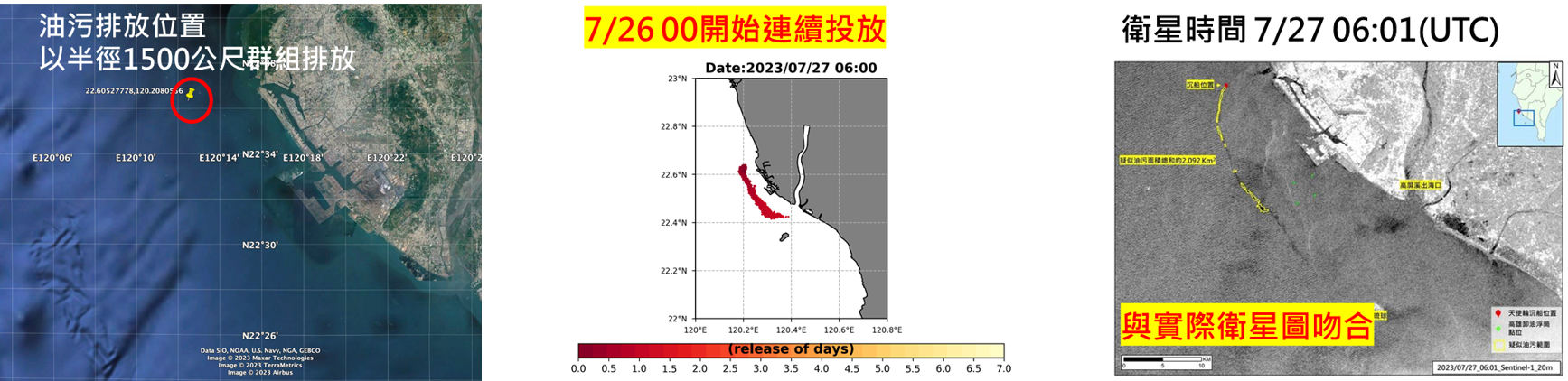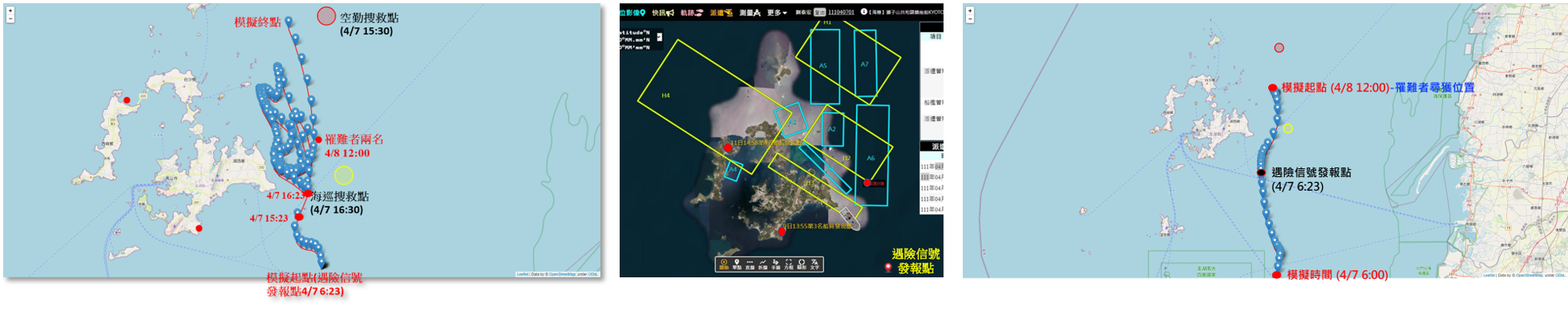上圖為2022年4月7日獅子山籍共和國「KYOTO」貨輪4月7日在澎湖發出遇險信號,我們分別利用遇險信號發報點與罹難者尋獲地點分別進行落海軌跡模擬。以遇險信號發報點為起點的模擬結果,漂流軌跡往北方前進,並於澎湖東北方滯留3天後往北,此模擬結果與其中2名罹難者位置重疊,並且與搜救指揮中心模擬搜救範圍高度重疊。以罹難者尋獲位置為起點進行回推落海軌跡模擬,模擬結果表示漂流軌跡往南方前進,並於途中經過遇險信號發報點。